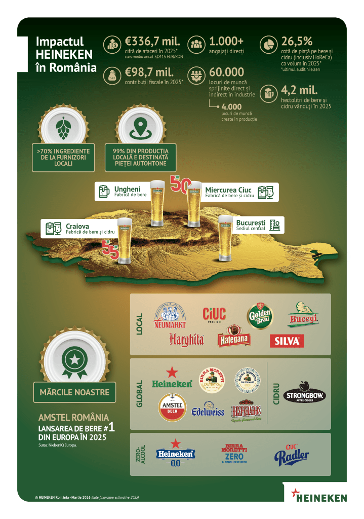 În România, HEINEKEN deține 3 fabrici, situate în Miercurea Ciuc, Craiova și Târgu Mureș.